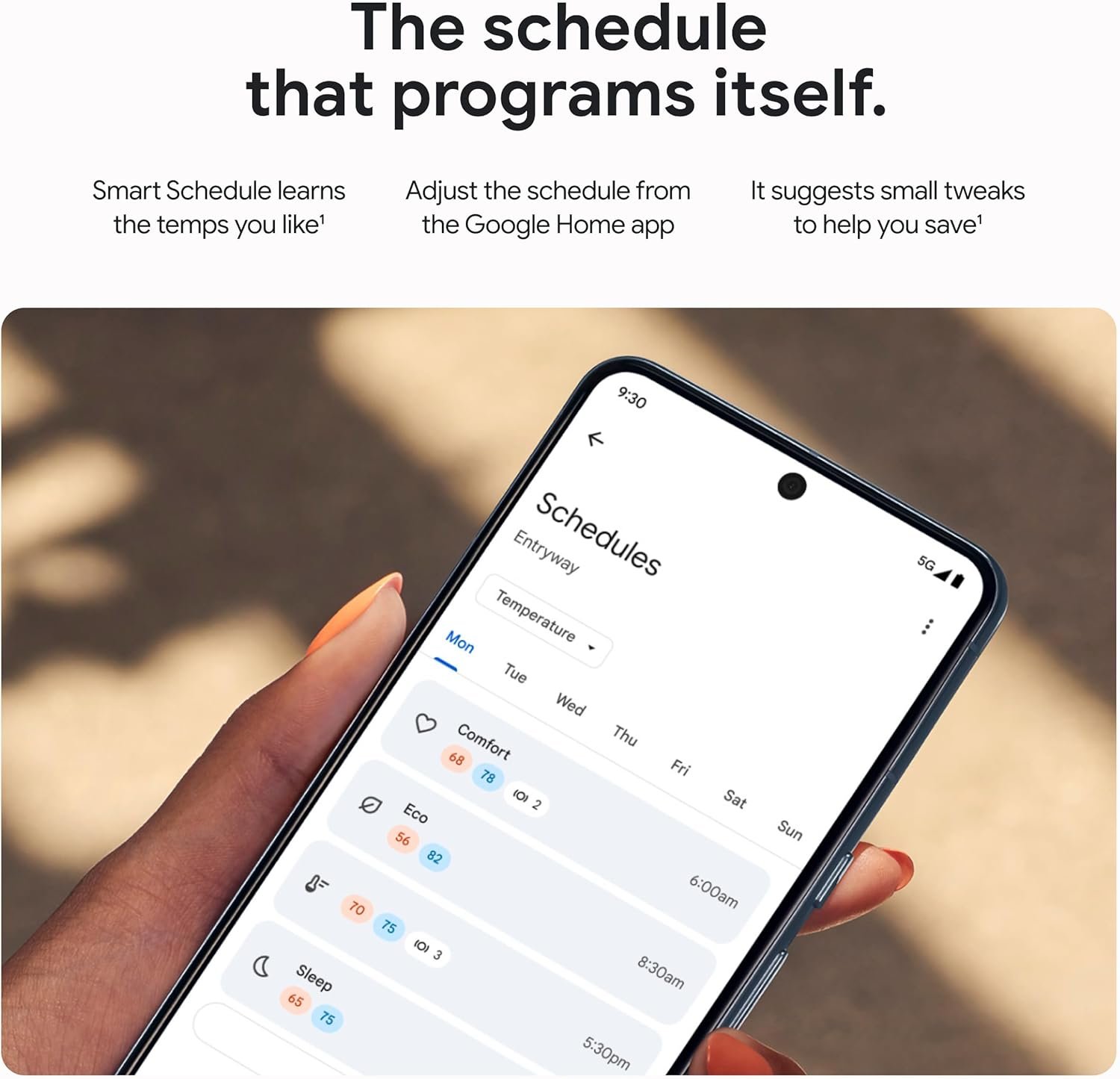 This thermostat includes advanced features like Eco Mode, which automatically reduces heating and cooling when you’re not at home, and Home/Away Assist, which uses sensors and your phone’s location to switch settings for maximum efficiency. You can control it from anywhere using the Google Home app or simply through voice commands with Google Assistant or Alexa. Its built-in energy-saving reports show you how much energy you’re using and how to reduce it even more.