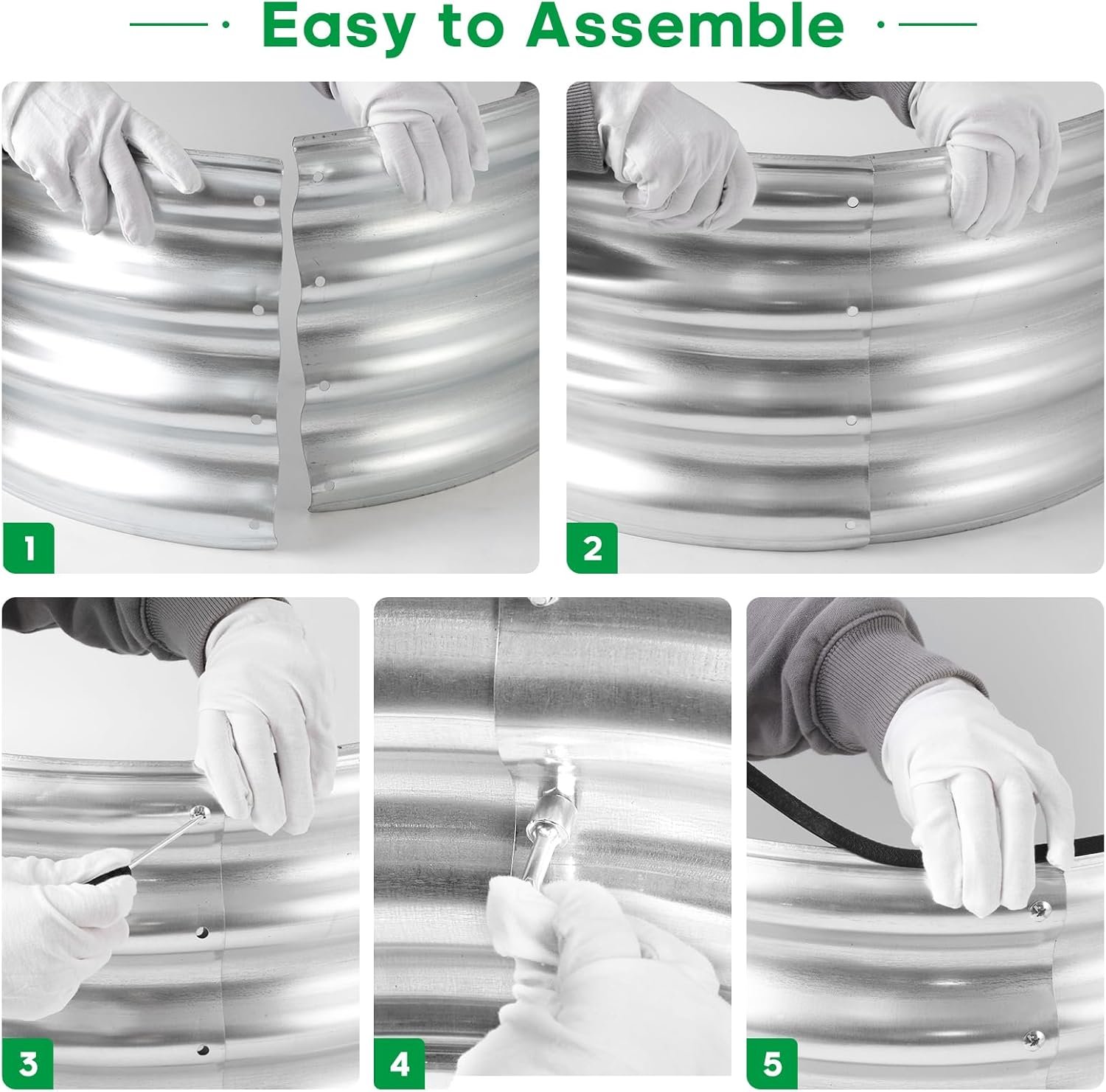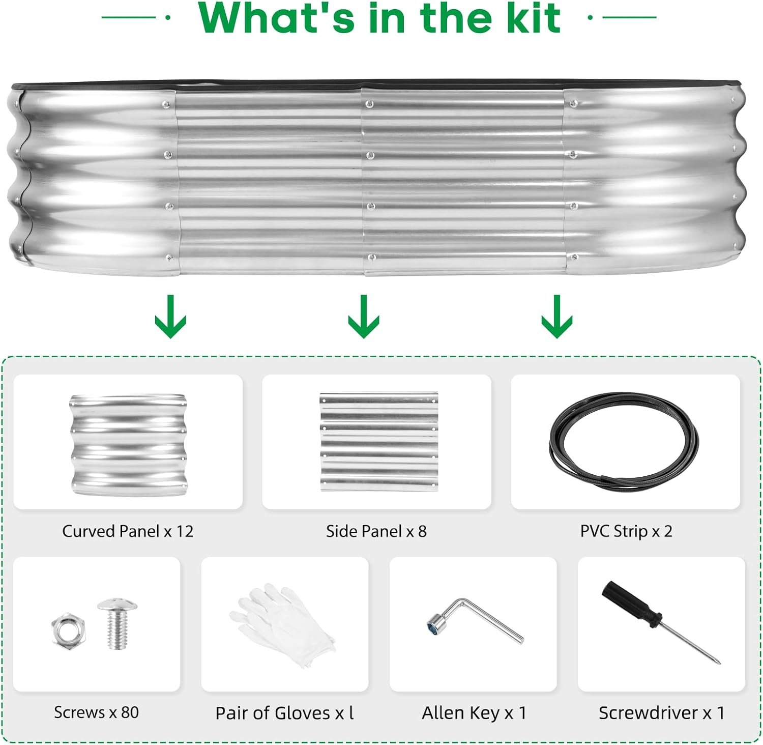 stant metal planter set ideal for vegetables, fruits, flowers, and herbs. Made from thickened galvanized steel and designed with an open base, it helps prevent water accumulation while promoting healthy root drainage. The kit comes with detailed assembly instructions, rubber edge strips, safety gloves, tools, and galvanized nuts and bolts for easier setup. With its sturdy frame, black rubber sealing edges, and no sharp corners, it’s designed for both functionality and safety in your garden or patio.