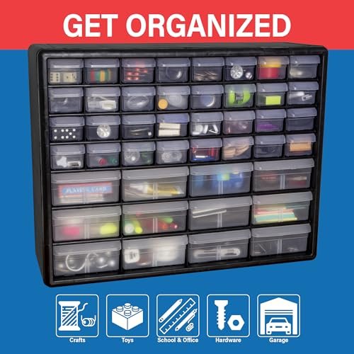 The Akro-Mils 44-Drawer Storage Cabinet offers heavy-duty, versatile organization for garages, classrooms, or home use with impact-resistant plastic construction, customizable drawers, and wall-mount options—perfect for anyone needing reliable storage!